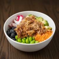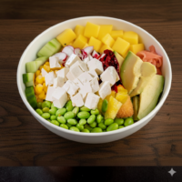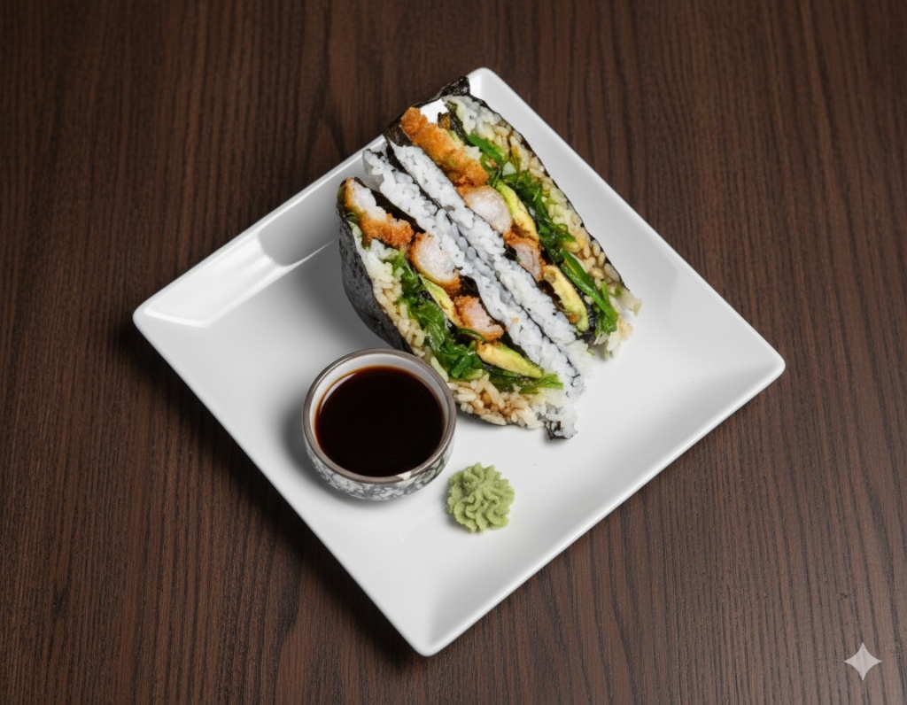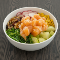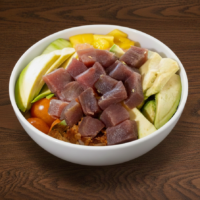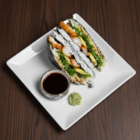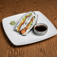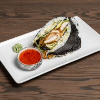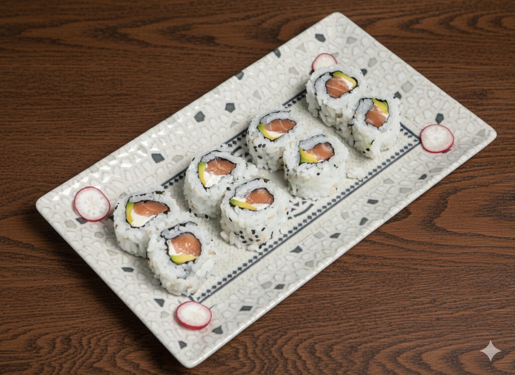 Arroz tipo sushi, Salmón, Aguacate y Salsa Yumi.