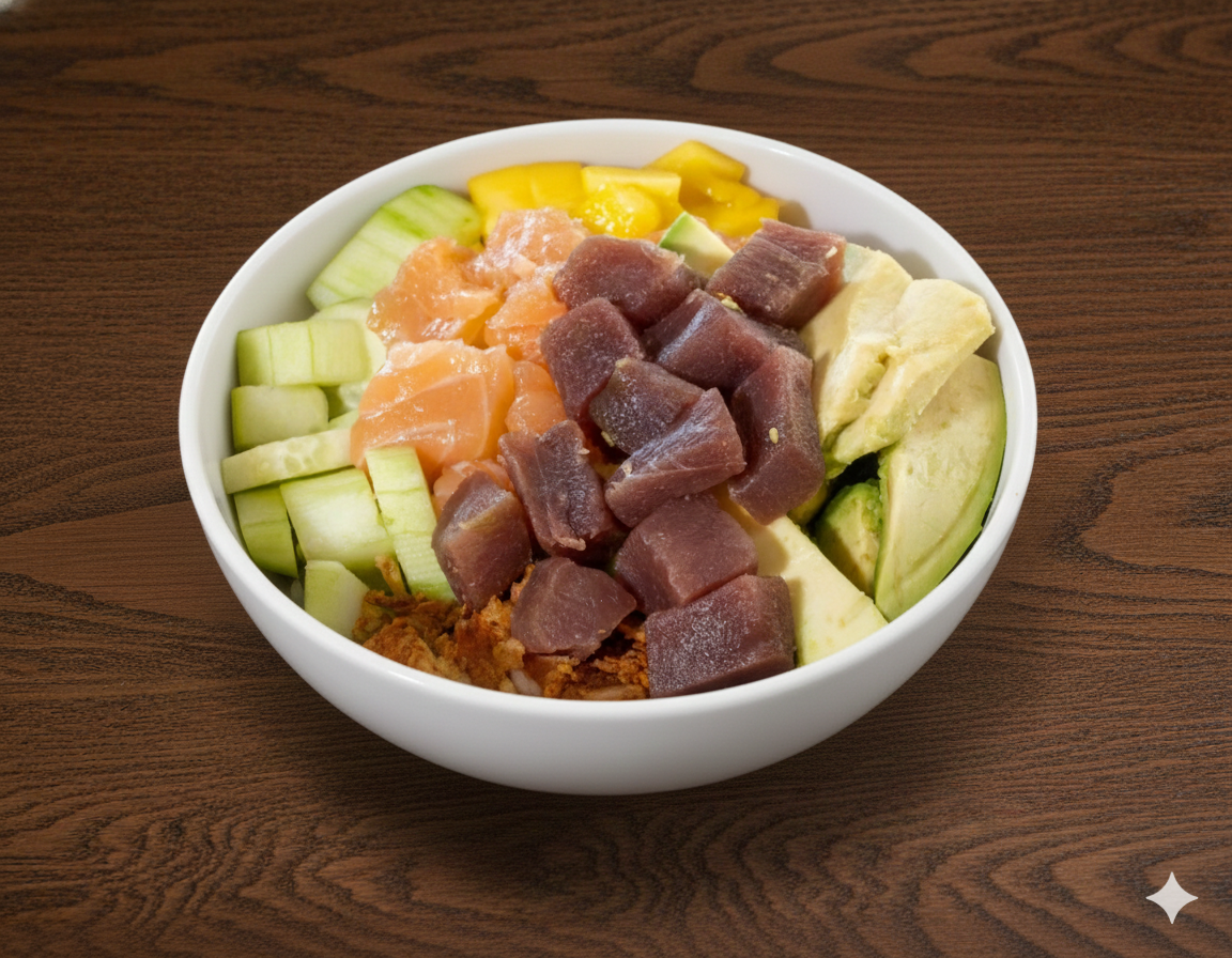 200 gramos de arroz sushi, salmón, atún, cebolla crunchy, huevo cocido, mango, queso feta, almendra picada, coco rallado y salsa yumi