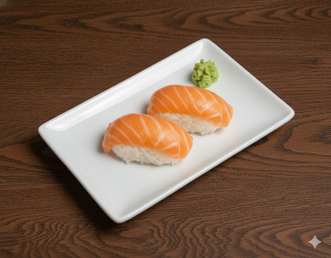 Fino corte de salmón fresco envuelto en una bolita de arroz de sushi.