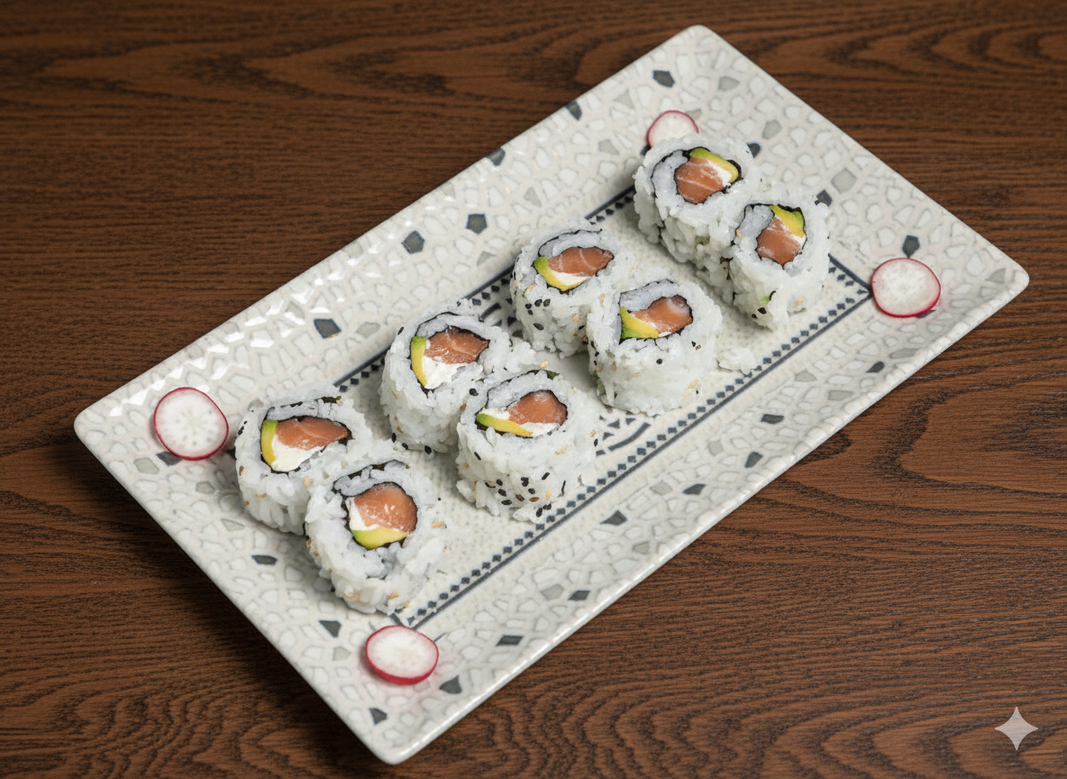 8 piezas de uramaki con alga nori, arroz sushi, sésamo,salmón, aguacate y queso crema